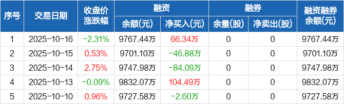 融资方面,当日融资买入215.92万元,融资偿还149.58万元,融资净买入66.34万元。融券方面,融券卖出0股,融券偿还0股,融券余量0股,融券余额0元。融资融券余额合计9767.44万元。