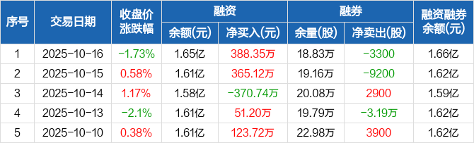 融资方面,当日融资买入881.48万元,融资偿还493.14万元,融资净买入388.35万元。融券方面,融券卖出100股,融券偿还3400股,融券余量18.83万股,融券余额96.41万元。融资融券余额合计1.66亿元。