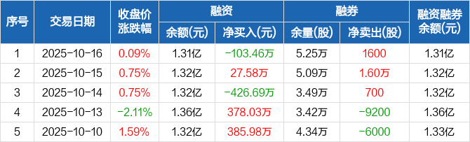 融资方面,当日融资买入562.86万元,融资偿还666.32万元,融资净偿还103.46万元。融券方面,融券卖出2200股,融券偿还600股,融券余量5.25万股,融券余额56.81万元。融资融券余额合计1.31亿元。