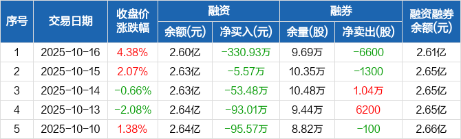 融资方面,当日融资买入2541.97万元,融资偿还2872.9万元,融资净偿还330.93万元,连续5日净偿还累计578.56万元。融券方面,融券卖出5400股,融券偿还1.2万股,融券余量9.69万股,融券余额154.75万元。融资融券余额合计2.61亿元。