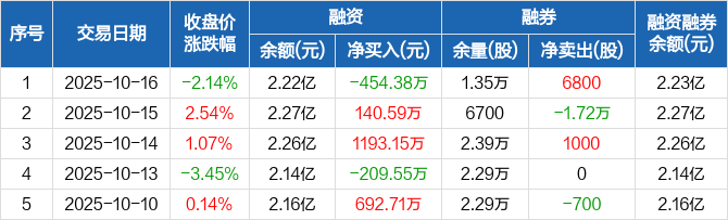 融资方面,当日融资买入599.29万元,融资偿还1053.68万元,融资净偿还454.38万元。融券方面,融券卖出6800股,融券偿还0股,融券余量1.35万股,融券余额19.17万元。融资融券余额合计2.23亿元。