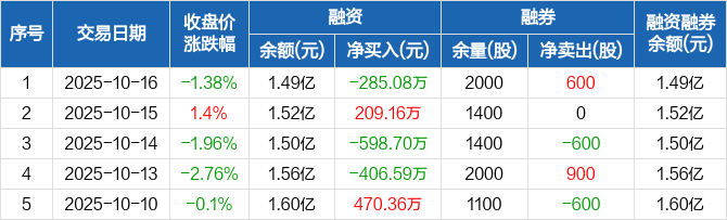 融资方面,当日融资买入353.89万元,融资偿还638.97万元,融资净偿还285.08万元。融券方面,融券卖出600股,融券偿还0股,融券余量2000股,融券余额2万元。融资融券余额合计1.49亿元。