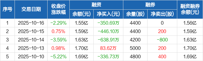 融资方面,当日融资买入766.25万元,融资偿还1116.94万元,融资净偿还350.69万元,连续3日净偿还累计1435.7万元。融券方面,融券卖出0股,融券偿还0股,融券余量4400股,融券余额10.34万元。融资融券余额合计1.56亿元。