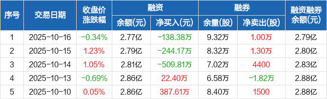 融资方面,当日融资买入211.49万元,融资偿还349.87万元,融资净偿还138.38万元,连续3日净偿还累计892.36万元。融券方面,融券卖出1.53万股,融券偿还5300股,融券余量9.32万股,融券余额190.76万元。融资融券余额合计2.79亿元。