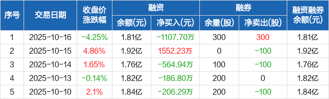 融资方面,当日融资买入1964.64万元,融资偿还3072.34万元,融资净偿还1107.7万元。融券方面,融券卖出300股,融券偿还0股,融券余量300股,融券余额2232元。融资融券余额合计1.81亿元。