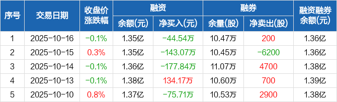 融资方面,当日融资买入263.05万元,融资偿还307.59万元,融资净偿还44.54万元,连续3日净偿还累计365.45万元。融券方面,融券卖出300股,融券偿还100股,融券余量10.47万股,融券余额105.54万元。融资融券余额合计1.36亿元。