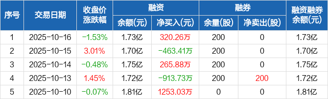 融资方面,当日融资买入776.53万元,融资偿还456.27万元,融资净买入320.26万元。融券方面,融券卖出0股,融券偿还0股,融券余量200股,融券余额2970元。融资融券余额合计1.73亿元。