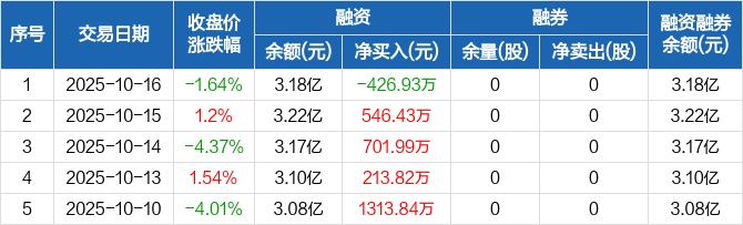 融资方面,当日融资买入1379.71万元,融资偿还1806.64万元,融资净偿还426.93万元。融券方面,融券卖出0股,融券偿还0股,融券余量0股,融券余额0元。融资融券余额合计3.18亿元。