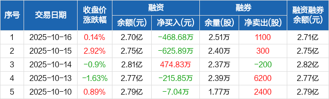 融资方面,当日融资买入783.88万元,融资偿还1252.55万元,融资净偿还468.68万元。融券方面,融券卖出1300股,融券偿还200股,融券余量2.51万股,融券余额37.17万元。融资融券余额合计2.71亿元。