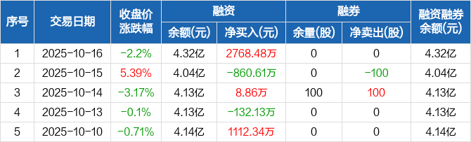 融资方面,当日融资买入5489.29万元,融资偿还2720.81万元,融资净买入2768.48万元。融券方面,融券卖出0股,融券偿还0股,融券余量0股,融券余额0元。融资融券余额合计4.32亿元。