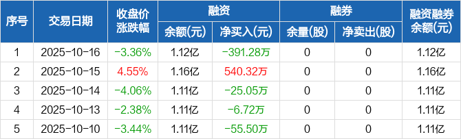 融资方面,当日融资买入1089.48万元,融资偿还1480.76万元,融资净偿还391.28万元。融券方面,融券卖出0股,融券偿还0股,融券余量0股,融券余额0元。融资融券余额合计1.12亿元。