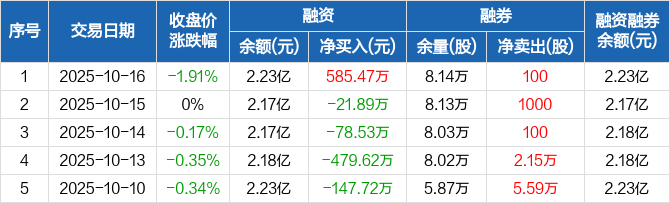 融资方面,当日融资买入1680.22万元,融资偿还1094.74万元,融资净买入585.47万元。融券方面,融券卖出100股,融券偿还0股,融券余量8.14万股,融券余额45.91万元。融资融券余额合计2.23亿元。