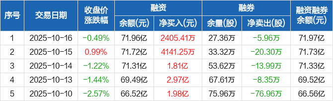 融资方面,当日融资买入4.03亿元,融资偿还3.79亿元,融资净买入2405.41万元,连续6日净买入累计7.79亿元。融券方面,融券卖出1.83万股,融券偿还7.79万股,融券余量27.36万股,融券余额111.63万元。融资融券余额合计71.97亿元。