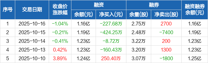 融资方面,当日融资买入189.81万元,融资偿还417.49万元,融资净偿还227.68万元,连续4日净偿还累计821.08万元。融券方面,融券卖出2700股,融券偿还0股,融券余量2.75万股,融券余额13.06万元。融资融券余额合计1.16亿元。