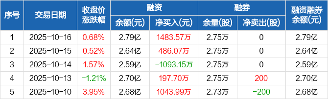 融资方面,当日融资买入2830.74万元,融资偿还1347.17万元,融资净买入1483.57万元。融券方面,融券卖出0股,融券偿还0股,融券余量2.75万股,融券余额16.17万元。融资融券余额合计2.79亿元。