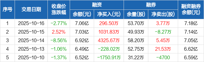 融资方面,当日融资买入3586.62万元,融资偿还3290.12万元,融资净买入296.5万元,连续3日净买入累计5653.99万元。融券方面,融券卖出5.2万股,融券偿还1.43万股,融券余量53.7万股,融券余额1189.46万元。融资融券余额合计7.18亿元。