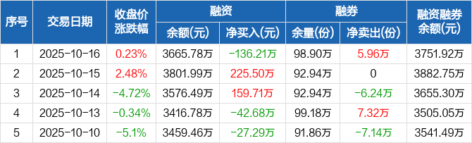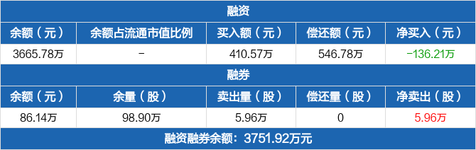 融资方面,当日融资买入410.57万元,融资偿还546.78万元,融资净偿还136.21万元。融券方面,融券卖出5.96万份,融券偿还0份,融券余量98.9万份,融券余额86.14万元。融资融券余额合计3751.92万元。