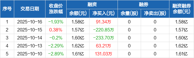 融资方面,当日融资买入464.19万元,融资偿还372.85万元,融资净买入91.34万元。融券方面,融券卖出0股,融券偿还0股,融券余量0股,融券余额0元。融资融券余额合计1.58亿元。