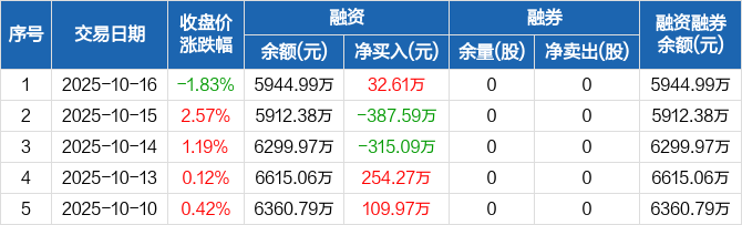 融资方面,当日融资买入308.46万元,融资偿还275.85万元,融资净买入32.61万元。融券方面,融券卖出0股,融券偿还0股,融券余量0股,融券余额0元。融资融券余额合计5944.99万元。