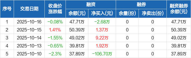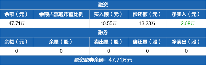 融资方面,当日融资买入10.55万元,融资偿还13.23万元,融资净偿还2.68万元。融券方面,融券卖出0份,融券偿还0份,融券余量0份,融券余额0元。融资融券余额合计47.71万元。