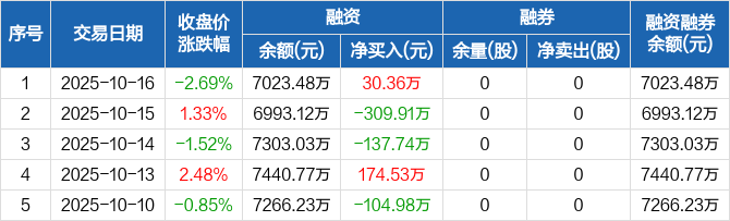 融资方面,当日融资买入240.95万元,融资偿还210.59万元,融资净买入30.36万元。融券方面,融券卖出0股,融券偿还0股,融券余量0股,融券余额0元。融资融券余额合计7023.48万元。