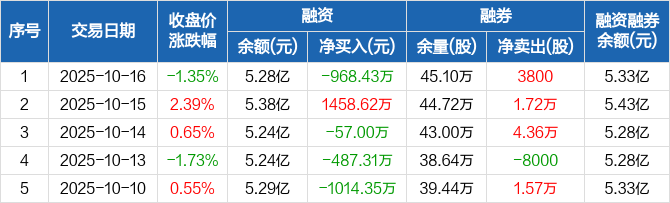 融资方面,当日融资买入2256.46万元,融资偿还3224.89万元,融资净偿还968.43万元。融券方面,融券卖出4400股,融券偿还600股,融券余量45.1万股,融券余额495.65万元。融资融券余额合计5.33亿元。