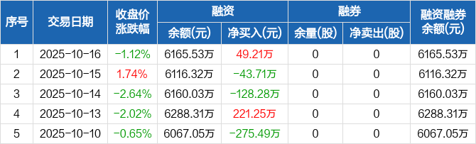 融资方面,当日融资买入186.22万元,融资偿还137.02万元,融资净买入49.21万元。融券方面,融券卖出0股,融券偿还0股,融券余量0股,融券余额0元。融资融券余额合计6165.53万元。