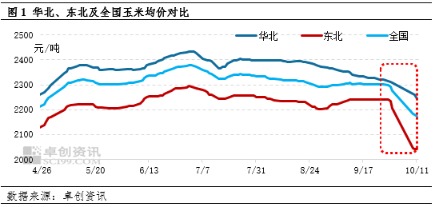 具体来看,进入10月份,东北、华北等产区新季玉米陆续收割上市,供应端增量明显,市场价格下跌。卓创资讯监测数据显示,10月上旬,东北、华北产区玉米日均价最大跌幅分别为161元/吨、46元/吨,全国市场旬均价2181元/吨,较9月下旬均价跌幅5.05%,较去年同期涨幅3.61%。由于东北市场新季玉米开秤价格高于去年同期,上市初期种植户积极售粮,下游加工企业亦积极收购,但由于到车量较多,企业收购价格持续下调。卓创资讯监测数据显示,10月上旬,东三省深加工企业玉米收购日均价累计下调120元/吨。