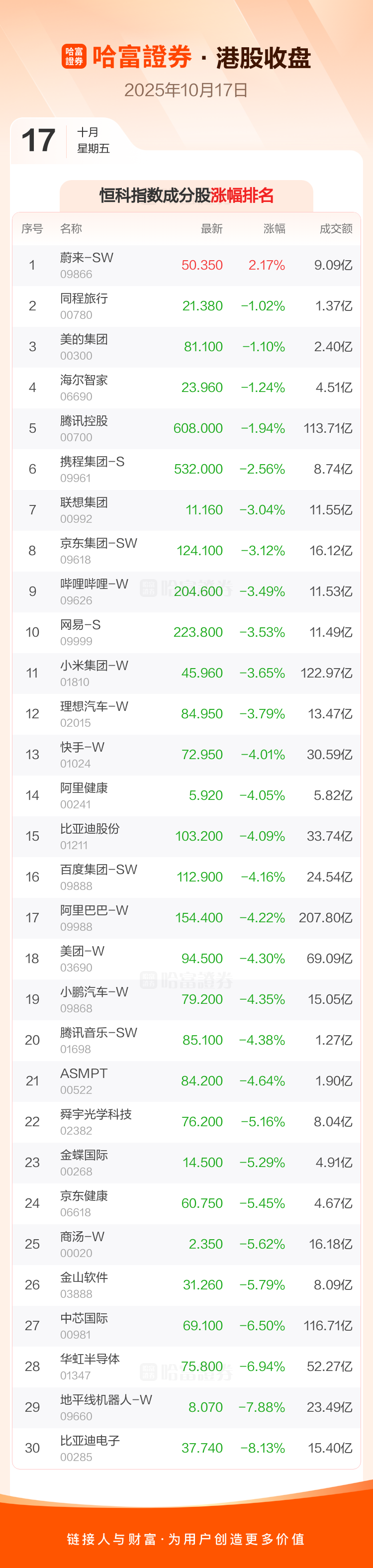 港股10月17日收盘走低 ,恒生指数收报25247.1点,跌641.41点,跌幅2.48%;恒生科技指数收报5760.38点,跌243.18点,跌幅4.05%。恒生指数成分股中周大福、翰森制药、恒隆地产涨幅居前,比亚迪电子、信义光能、中芯国际跌幅靠前。恒生科技指数成分股中蔚来-SW、同程旅行、美的集团涨幅居前,比亚迪电子、地平线机器人-W、华虹半导体跌幅靠前。