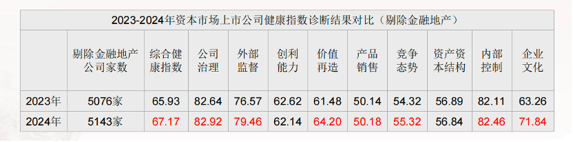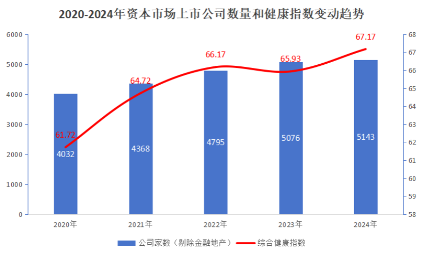 报告显示,2024年全市场5143家上市公司(剔除银行、非银金融和房地产)的综合健康指数平均为67.17,较2023年的65.93上升1.24,自2020年以来总体呈现稳步上升态势。