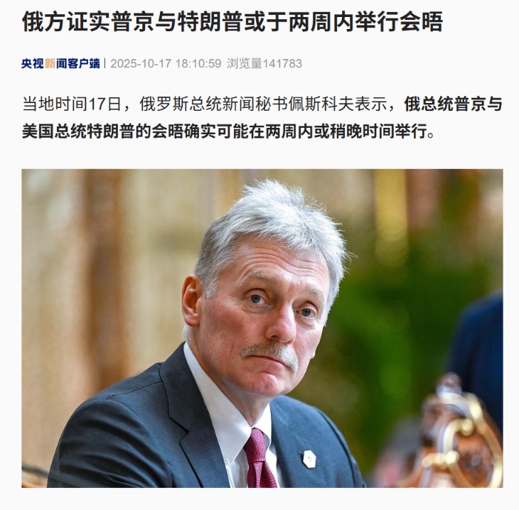 当地时间17日,俄罗斯总统新闻秘书佩斯科夫表示,俄总统普京与美国总统特朗普的会晤确实可能在两周内或稍晚时间举行。