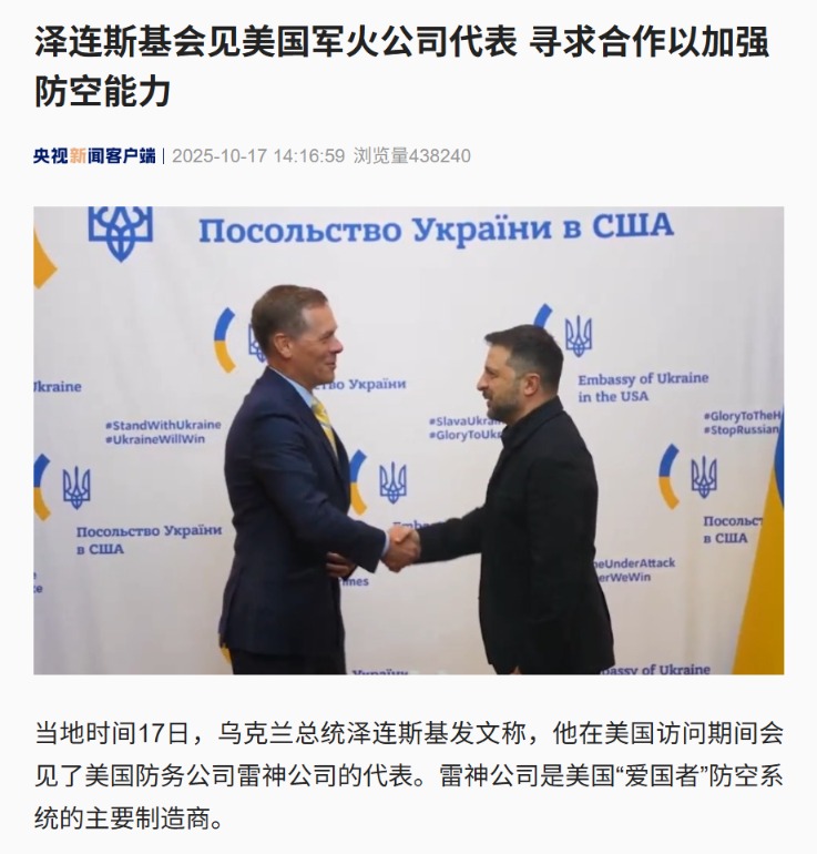 当地时间17日,乌克兰总统泽连斯基发文称,他在美国访问期间会见了美国防务公司雷神公司的代表。雷神公司是美国“爱国者”防空系统的主要制造商。