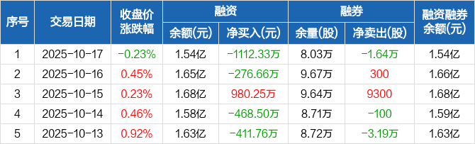融资方面,当日融资买入516.5万元,融资偿还1628.84万元,融资净偿还1112.33万元。融券方面,融券卖出0股,融券偿还1.64万股,融券余量8.03万股,融券余额35.41万元。融资融券余额合计1.54亿元。