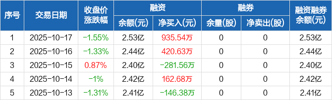 融资方面,当日融资买入1619.49万元,融资偿还683.96万元,融资净买入935.54万元。融券方面,融券卖出0股,融券偿还0股,融券余量0股,融券余额0元。融资融券余额合计2.53亿元。