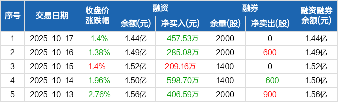 融资方面,当日融资买入665.63万元,融资偿还1123.16万元,融资净偿还457.53万元。融券方面,融券卖出0股,融券偿还0股,融券余量2000股,融券余额1.98万元。融资融券余额合计1.44亿元。