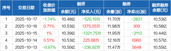 融资方面,当日融资买入3691.23万元,融资偿还4211.42万元,融资净偿还520.19万元。融券方面,融券卖出1300股,融券偿还4137股,融券余量11.7万股,融券余额457.19万元。融资融券余额合计10.53亿元。