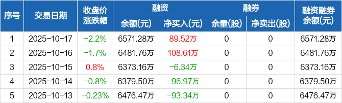 融资方面,当日融资买入361.39万元,融资偿还271.87万元,融资净买入89.52万元。融券方面,融券卖出0股,融券偿还0股,融券余量0股,融券余额0元。融资融券余额合计6571.28万元。