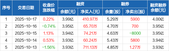 融资方面,当日融资买入1409.81万元,融资偿还998.84万元,融资净买入410.97万元,连续5日净买入累计1322.26万元。融券方面,融券卖出8000股,融券偿还2100股,融券余量5.29万股,融券余额70.89万元。融资融券余额合计4亿元。