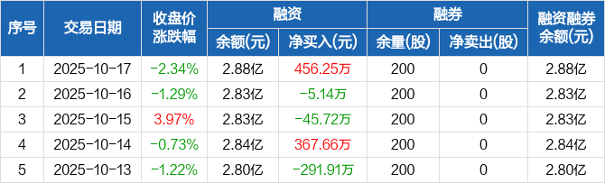 融资方面,当日融资买入2344.92万元,融资偿还1888.68万元,融资净买入456.25万元。融券方面,融券卖出0股,融券偿还0股,融券余量200股,融券余额4344元。融资融券余额合计2.88亿元。