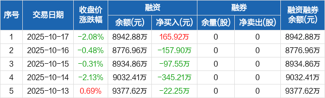 融资方面,当日融资买入721.37万元,融资偿还555.45万元,融资净买入165.92万元。融券方面,融券卖出0股,融券偿还0股,融券余量0股,融券余额0元。融资融券余额合计8942.88万元。