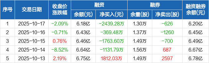 融资方面,当日融资买入5361.84万元,融资偿还7801.12万元,融资净偿还2439.28万元,连续4日净偿还累计5704.14万元。融券方面,融券卖出500股,融券偿还1126股,融券余量1.3万股,融券余额229.28万元。融资融券余额合计6.2亿元。