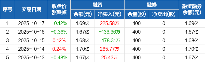 融资方面,当日融资买入560.97万元,融资偿还335.39万元,融资净买入225.58万元。融券方面,融券卖出0股,融券偿还0股,融券余量400股,融券余额3348元。融资融券余额合计1.69亿元。