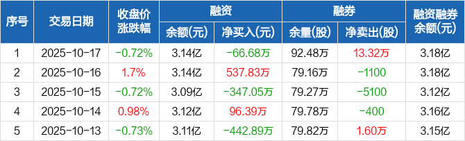 融资方面,当日融资买入1859.44万元,融资偿还1926.12万元,融资净偿还66.68万元。融券方面,融券卖出13.58万股,融券偿还2600股,融券余量92.48万股,融券余额383.79万元。融资融券余额合计3.18亿元。