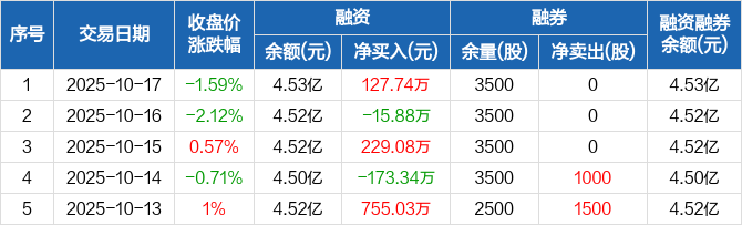 融资方面,当日融资买入1827.27万元,融资偿还1699.53万元,融资净买入127.74万元。融券方面,融券卖出0股,融券偿还0股,融券余量3500股,融券余额2.38万元。融资融券余额合计4.53亿元。