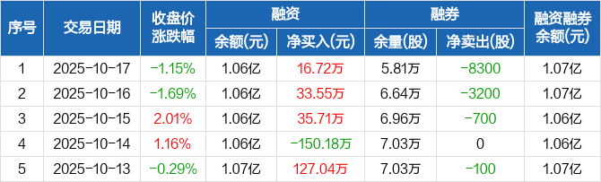融资方面,当日融资买入936.39万元,融资偿还919.67万元,融资净买入16.72万元,连续3日净买入累计85.98万元。融券方面,融券卖出2100股,融券偿还1.04万股,融券余量5.81万股,融券余额20.04万元。融资融券余额合计1.07亿元。