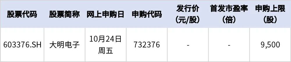根据目前安排,下周将有1只沪市主板新股上市。拟于下周五(10月24日)申购的大明电子为我国汽车车身电子电器控制系统领域的头部供应商之一。公司长期同步参与整车厂商配套零部件的开发工作,与长安汽车、上汽集团、一汽集团、比亚迪、吉利汽车、长城汽车、赛力斯、江淮汽车、蔚来汽车、理想汽车等国内主要自主品牌整车厂商和广汽丰田、长安马自达、上汽大众、上汽通用、东风日产、一汽丰田、长安福特、北京奔驰、捷豹路虎等合资整车厂商建立了稳定的合作关系;并已成功进入福特汽车、丰田汽车、斯堪尼亚等知名外资品牌供应链体系。