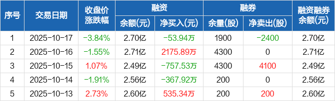 融资方面,当日融资买入2370.37万元,融资偿还2424.31万元,融资净偿还53.94万元。融券方面,融券卖出100股,融券偿还2500股,融券余量1900股,融券余额4.76万元。融资融券余额合计2.7亿元。