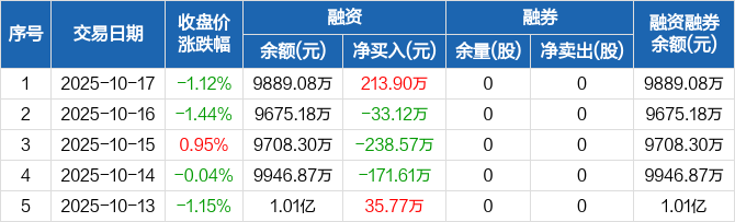 融资方面,当日融资买入487.6万元,融资偿还273.7万元,融资净买入213.9万元。融券方面,融券卖出0股,融券偿还0股,融券余量0股,融券余额0元。融资融券余额合计9889.08万元。