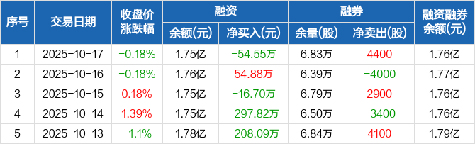 融资方面,当日融资买入482.89万元,融资偿还537.44万元,融资净偿还54.55万元。融券方面,融券卖出4500股,融券偿还100股,融券余量6.83万股,融券余额74.44万元。融资融券余额合计1.76亿元。