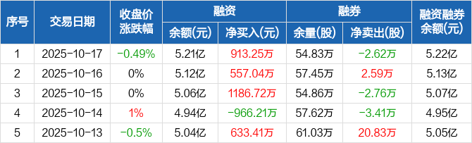 融资方面,当日融资买入5547.62万元,融资偿还4634.37万元,融资净买入913.25万元,连续3日净买入累计2657.01万元。融券方面,融券卖出0股,融券偿还2.62万股,融券余量54.83万股,融券余额110.76万元。融资融券余额合计5.22亿元。